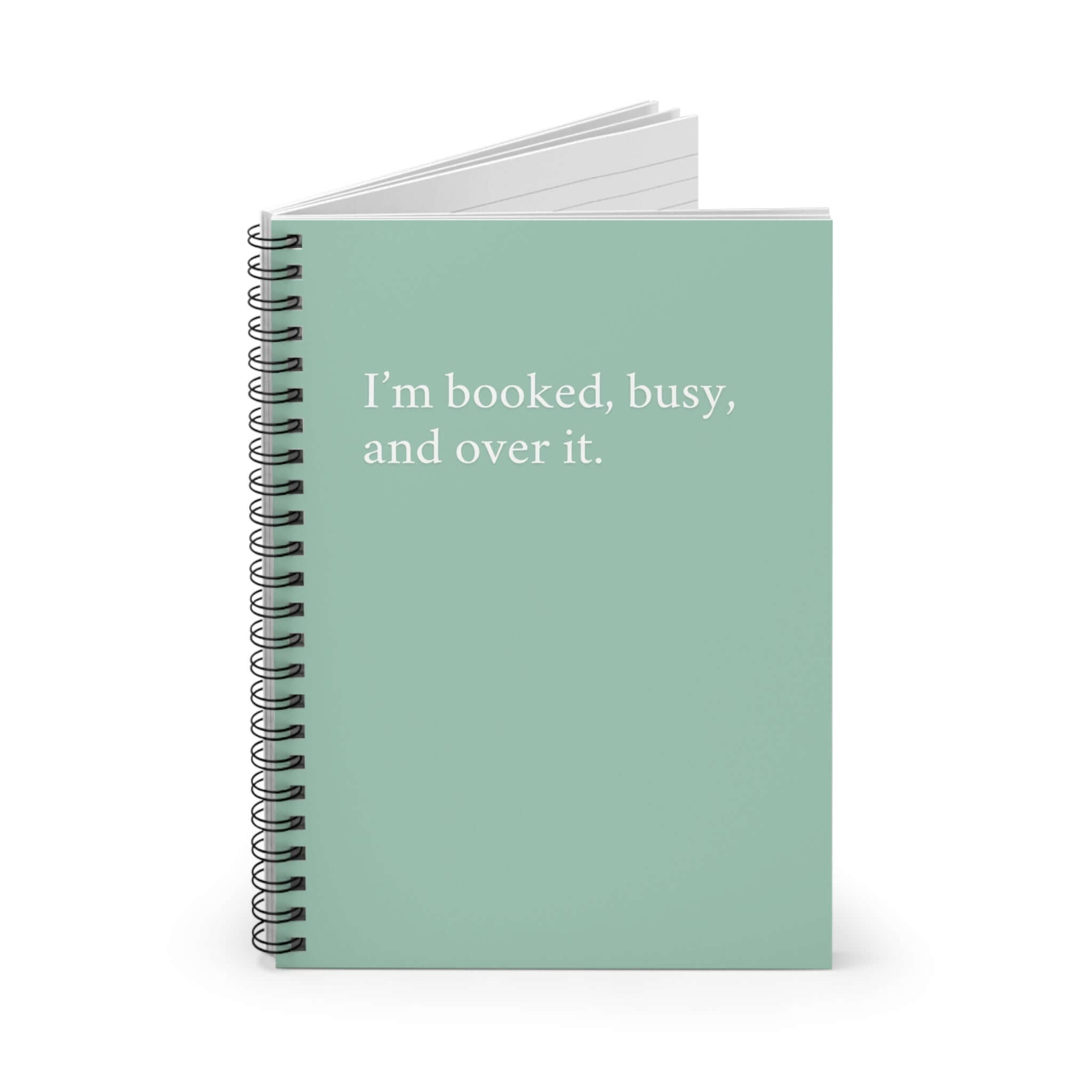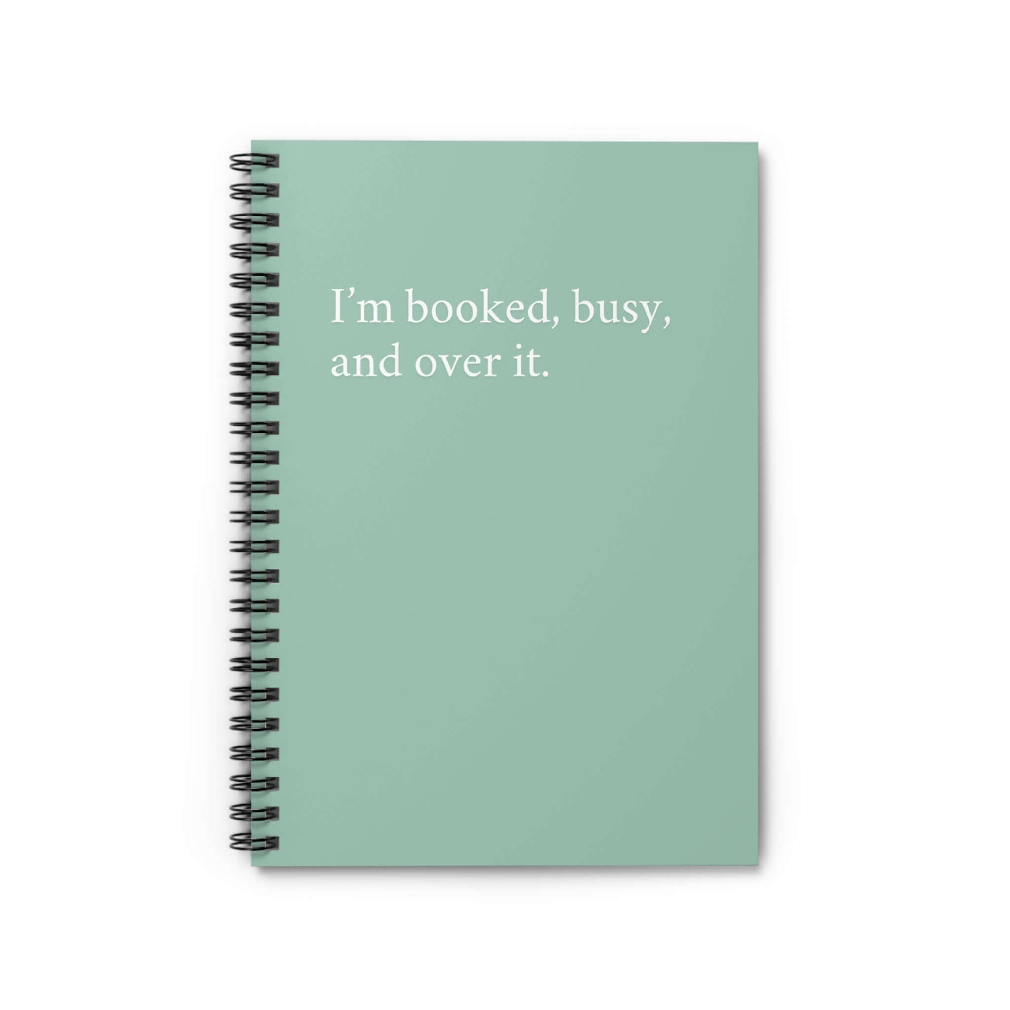 A sleek and stylish ruled line notebook with the sassy quote 'I’m booked, busy, and over it'. Perfect for busy professionals and students who need to keep organized and jot down their thoughts. Ideal for back to school, office use, or as a gift for someone who loves stationary.