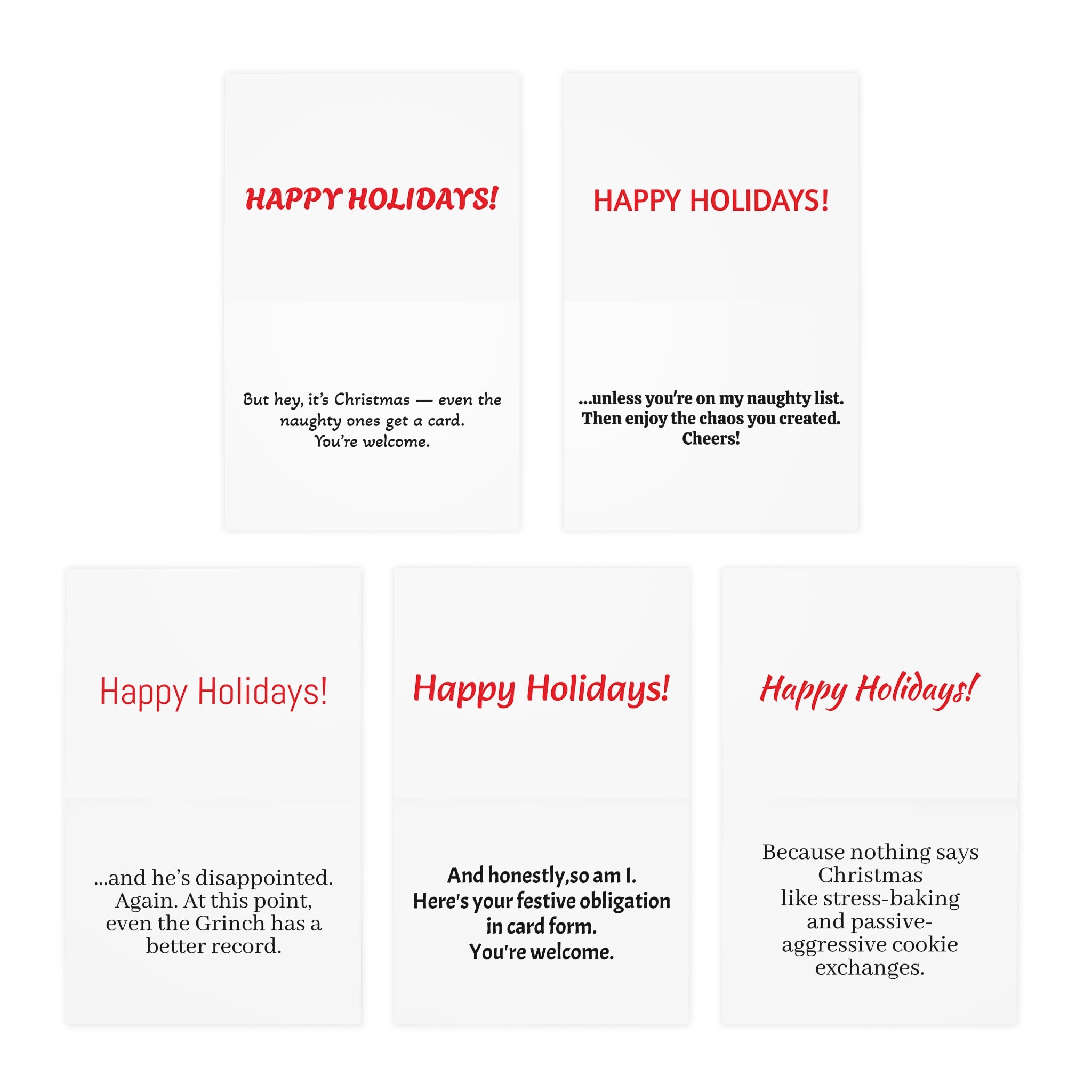 A horizontal pack of 5 sarcastic Christmas cards, each with a different snarky cover